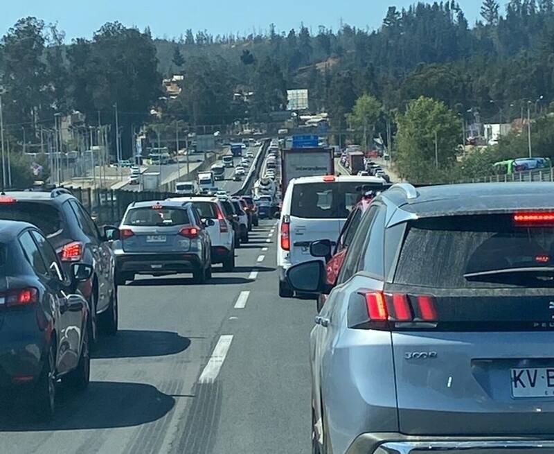 La cuenta de Twitter de Rutas del Pacífico indicó que hay tránsito lento en el lugar desde "el kilómetro 100, sector enlace La Pólvora, al kilómetro 98, sector Placilla en dirección a Valparaíso".