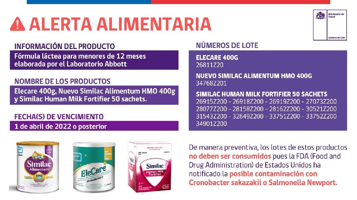 El Ministerio de Salud emitió una alerta para no consumir determinados lotes de los productos Elecare 400 g; Nuevo Similac Alimentum HMO 400 g y Similac Human Milk Fortifier 50 sachets, ante la posibilidad de contener la presencia de Cronobacter Sakazakii o Salmonella Newport.