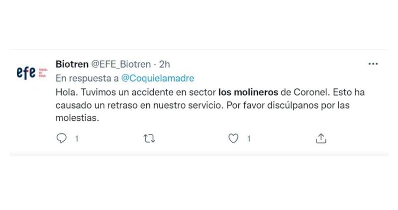Por su parte, la empresa Biotren EFE emitió un comunicado en Twitter pidiendo "disculpas" por el retraso del transporte público debido a la molestia de los pasajeros.