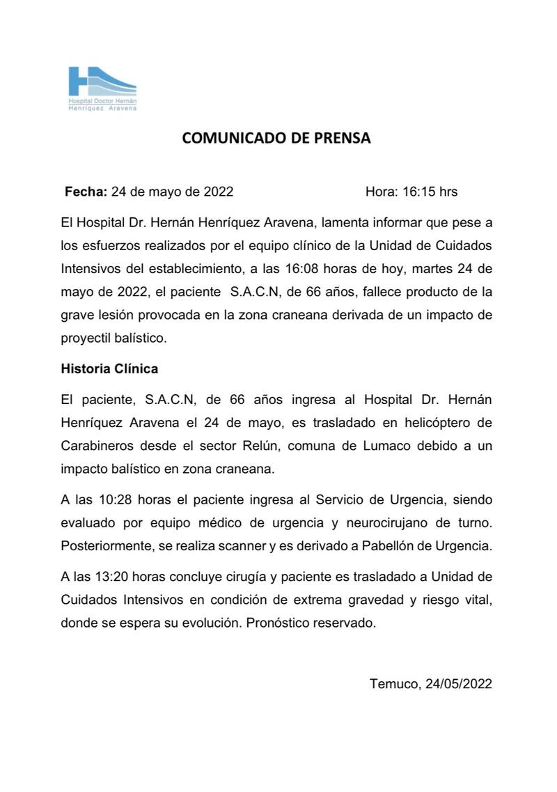 A través de un comunicado, el Hospital Dr. Hernán Henríquez Aravena comunicó que "pese a los esfuerzos realizados por el equipo clínico de la Unidad de Cuidados Intensivos del establecimiento, a las 16:08 horas de hoy, martes 24 de mayo de 2022, el paciente S.A.C.N, de 66 años, fallece producto de la grave lesión".