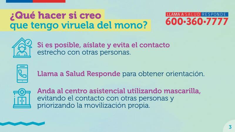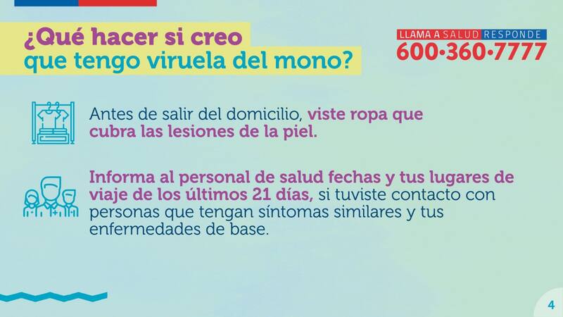 Se remienda a las personas que asistan al doctor en caso de tener contacto estrecho con la piel de una persona con lesiones, incluido contacto sexual, y presenten lesiones en la piel de forma súbita, con síntomas como fiebre, ganglios inflamados, dolor muscular, decaimiento y dolor de espalda. Si viajó al extranjero en las últimas semanas, puede ser de especial importancia.