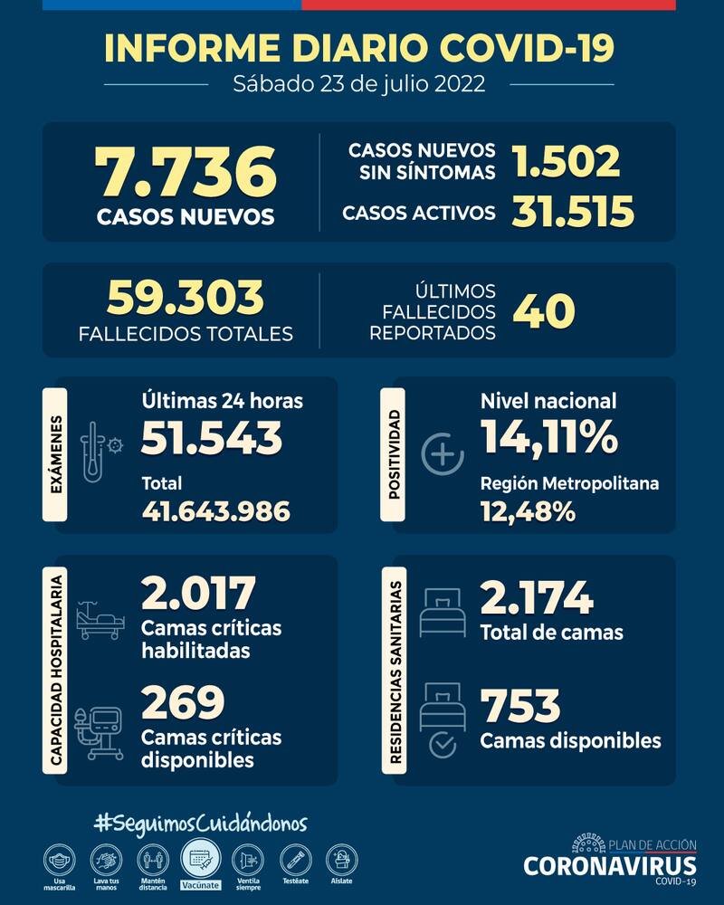 7.736 casos nuevos de Covid-19 reportó este sábado 23 de julio el Ministerio de Salud (Minsal), de los cuales 4.200 corresponden a personas sintomáticas y 1.502 no presentan síntomas. Además, se registraron 2.206 test PCR positivos que no fueron notificados.