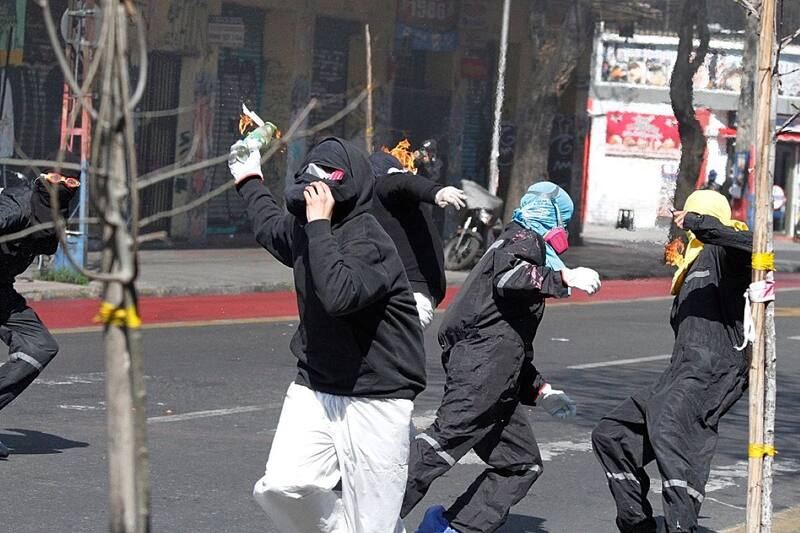 Personal de Control de Orden Público de Carabineros acudió al sector con el carro lanza-aguas para repeler a los encapuchados, algunos de los cuales están ocupando overoles blancos.