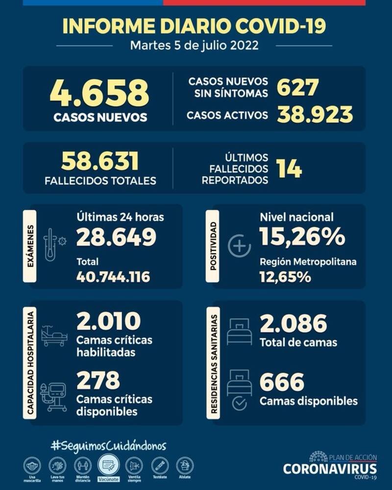 Este martes 5 de julio se registraron 4.658 casos nuevos de Covid-19, según datos entregados por el Ministerio de Salud (Minsal). Además, 2.956 corresponden a personas sintomáticas y 627 no presentan síntomas, alcanzando una positividad de 15,26% a nivel nacional.