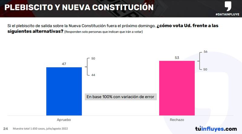 La última encuesta Data Influye, de la consultora "Tú Influyes", informó que entre quienes sostienen que irán a votar en el Plebiscito de Salida, un 53% se inclina por el Rechazo y un 47% lo hace por el Apruebo a la nueva Constitución.