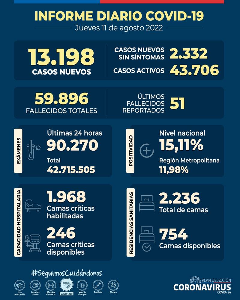 Este jueves 11 de agosto el Ministerio de Salud registró 13.198 casos nuevos de Covid-19, de los cuales 7.350 corresponden a personas sintomáticas y 2.332 no presentan síntomas. Además, se registraron 3.516 test PCR Positivo que no fueron notificados.