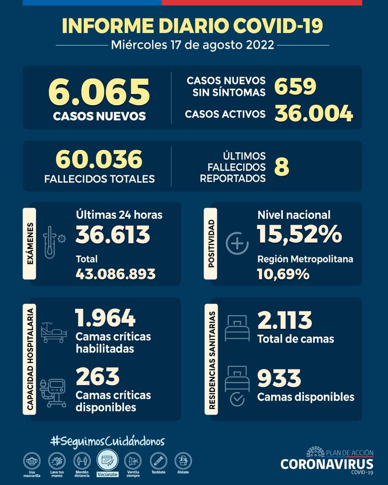 El Ministerio de Salud informó 6.065 nuevos casos de Covid-19 en su balance de este miércoles 17 de agosto, del total, 4.059 corresponden a personas sintomáticas y 659 no presentan síntomas.