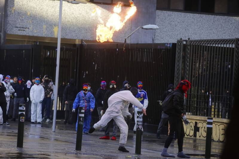 Los sujetos iniciaron barricadas en la intersección de Arturo Prat con la Alameda, donde se enfrentaron con personal de Carabineros.