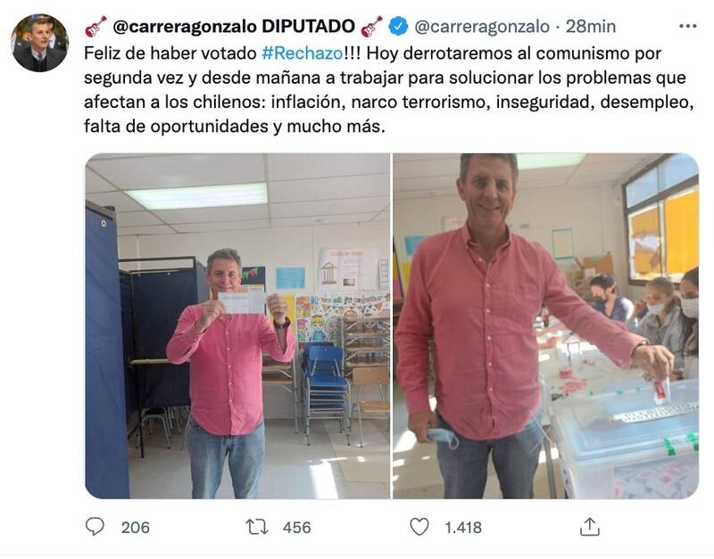 El tuit incluye dos fotos, acompañadas del siguiente escrito: "Feliz de haber votado #Rechazo!!! Hoy derrotaremos al comunismo por segunda vez y desde mañana a trabajar para solucionar los problemas que afectan a los chilenos: inflación, narco terrorismo, inseguridad, desempleo, falta de oportunidades y mucho más".