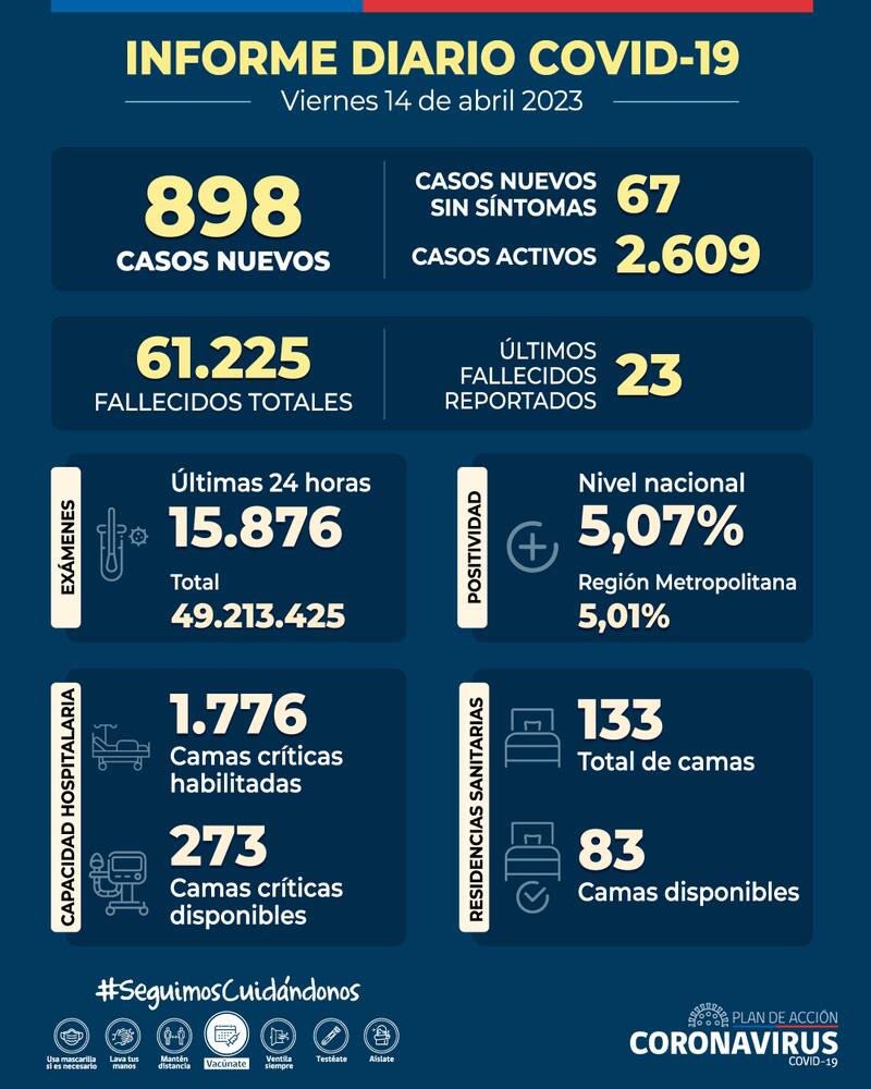 Este viernes 14 de abril el Ministerio de Salud entregó un nuevo balance de la pandemia en el país, registrando 898 casos nuevos de Covid-19, de los cuales 595 corresponden a personas sintomáticas y 67 no presentan síntomas. Además, se registraron 236 test PCR Positivo que no fueron notificados.