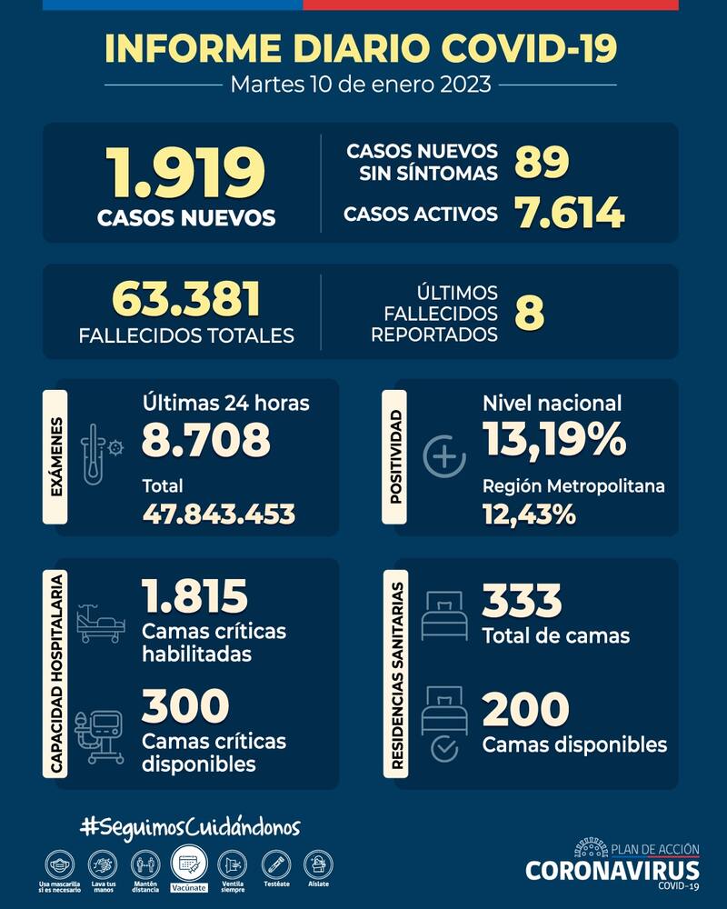 Este martes 10 de enero el Ministerio de Salud publicó un nuevo balance sobre el Covid-19 en Chile, reportando 1.919 casos nuevos, de los cuales 1.440 corresponden a personas sintomáticas y 89 no presentan síntomas. Además, se registraron 390 test PCR Positivo que no fueron notificados.