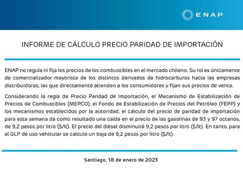 La Empresa Nacional del Petróleo (ENAP) anunció un nuevo descenso en el precio de todos los combustibles, a partir de este jueves 19 de enero en todo el país.