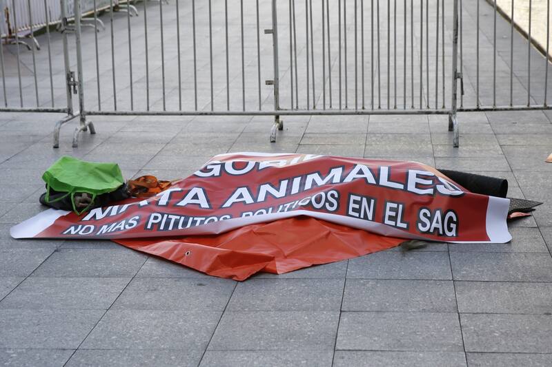 Luego, desplegaron un cartel donde se leía que "el Gobierno mata animales. No más pitutos políticos en el SAG", mientras el cuerpo inerte permanecía a sus pies, ante el asombro de los presentes. La situación tuvo que ser intervenida por Carabineros de la 1ª Comisaría de Santiago, quienes cubrieron el cadáver.