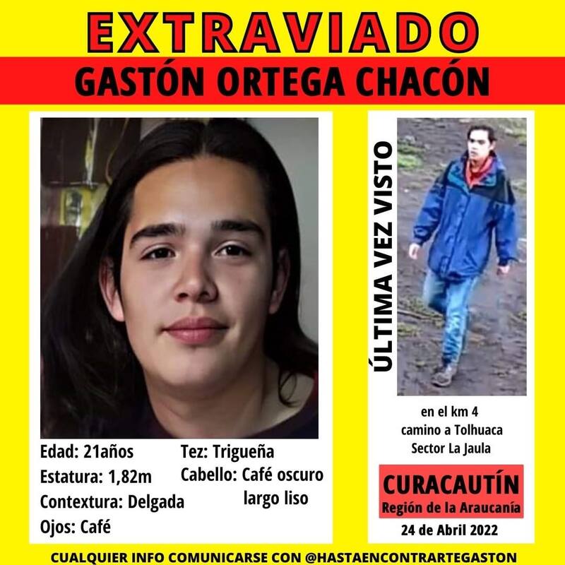 Gastón Andrés Ortega Chacón tenía 21 años, era oriundo de Temuco y se encontraba estudiando Medicina Veterinaria de la Universidad Santo Tomás. La última vez que se le vio fue el 24 de abril de 2022, a la altura del km 4.3 camino a Tolhuaca, en el sector La Jaula.