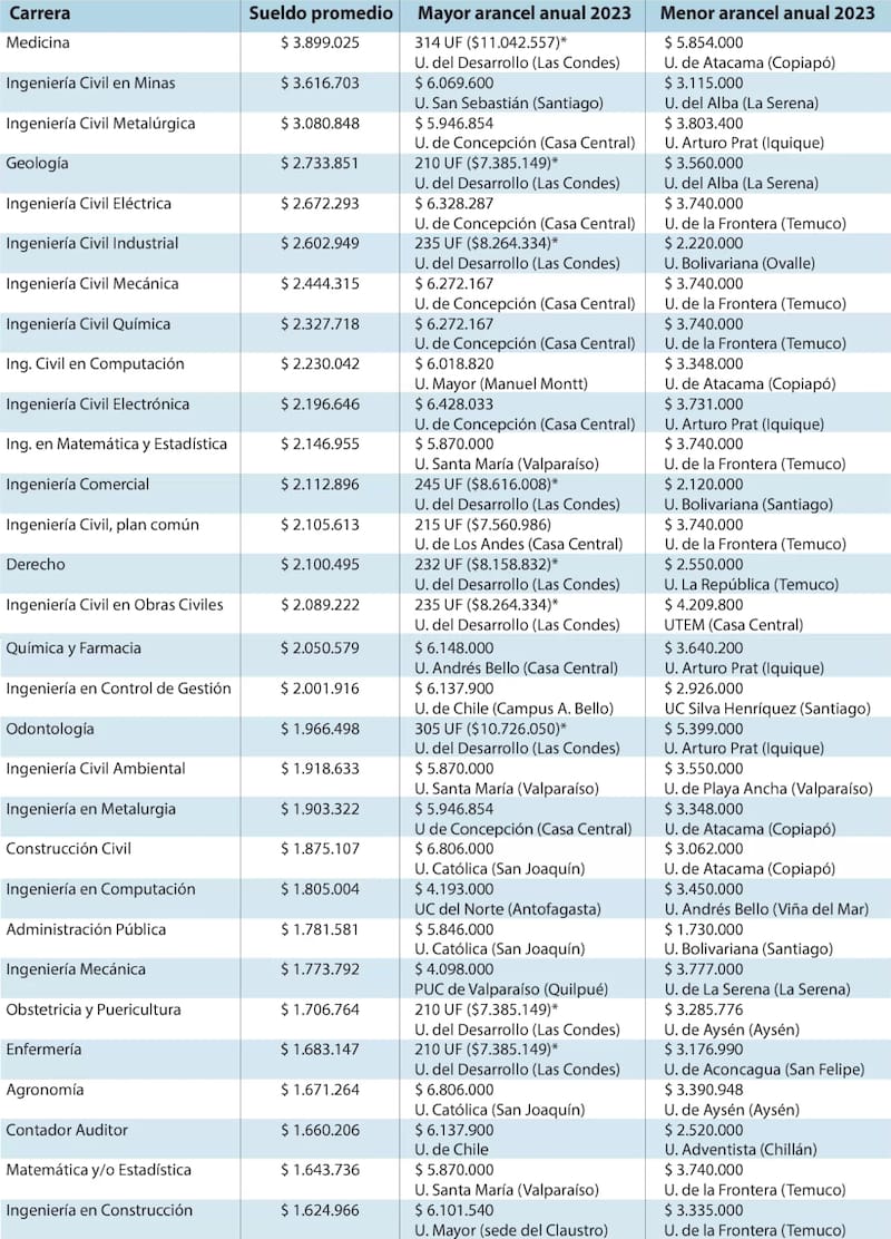 El diario Las Últimas Noticias publicó un artículo en donde, utilizando información del portal Mi Futuro, revelaban los aranceles más altos y bajos en las carreras mejor pagadas de Chile.