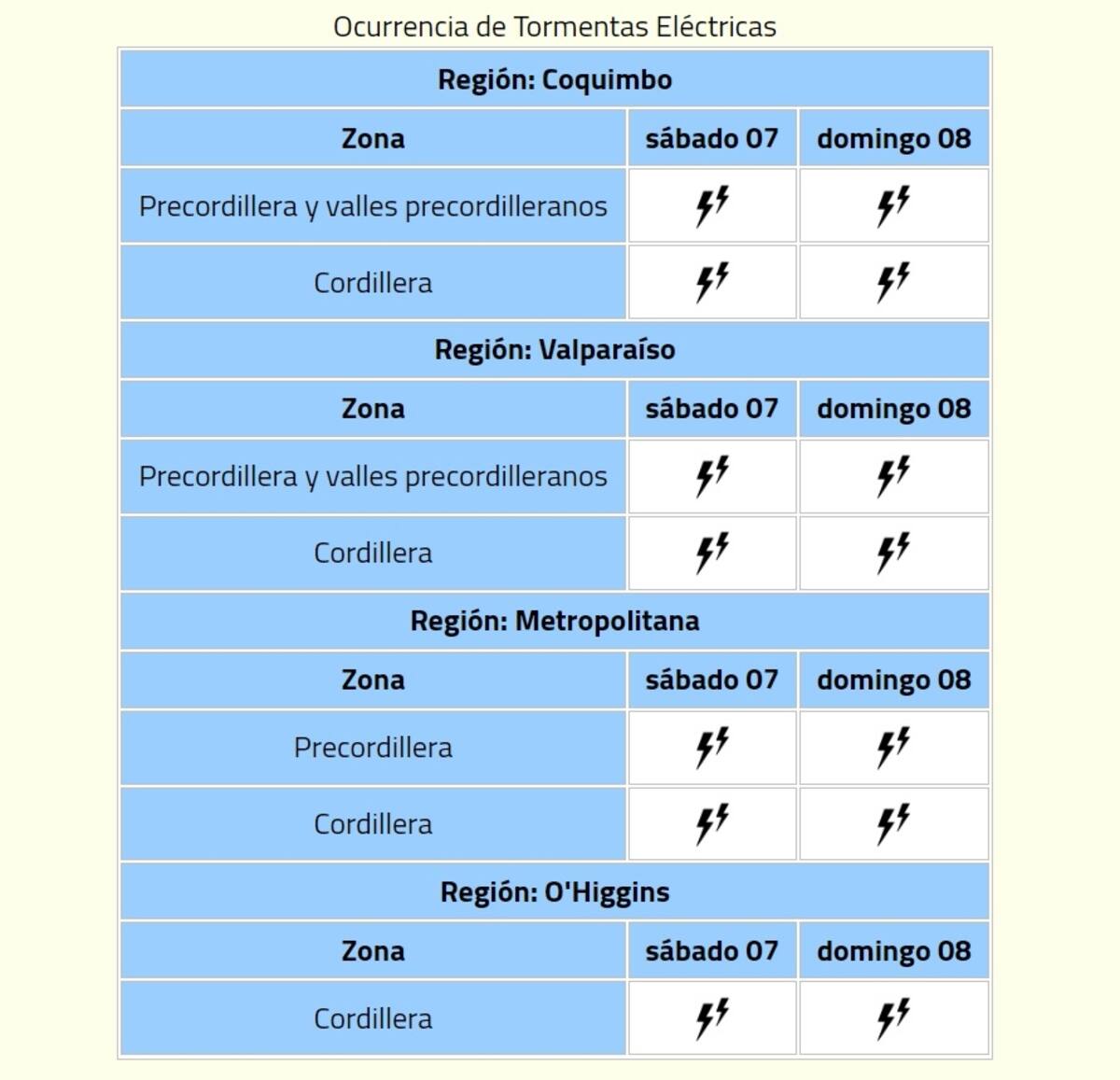 Las probables tormentas eléctricas afectarán en la Región de Coquimbo, en la precordillera, valles precordilleranos y cordillera; en Valparaíso, en precordillera, valles precordilleranos y cordillera; en la Región Metropolitana, en precordillera y cordillera, y en O'Higgins, en cordillera.