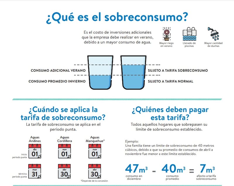 La tarifa de sobreconsumo se aplica a quienes utilizan una mayor cantidad de agua en verano, medida que se asocia al costo de operación, mantención y reposición de las instalaciones durante el período punta.