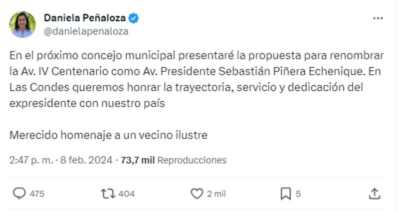 A través de su cuenta de X, anteriormente conocida como Twitter, la jefa comunal comentó que “en el próximo concejo municipal presentaré la propuesta para renombrar la Av. IV Centenario como Av. Presidente Sebastián Piñera Echenique”.