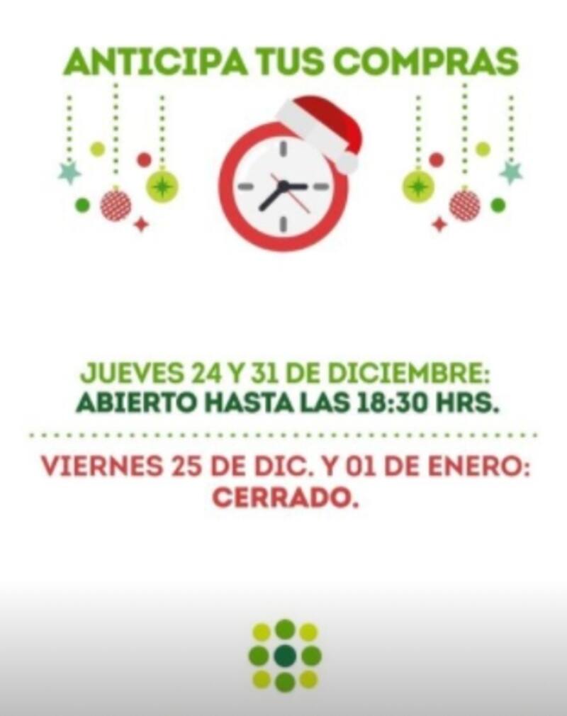 - Jueves 24: Abierto hasta las 18:30 hrs.