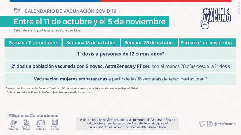 Para este miércoles 20 de octubre se podrán acercar a recibir la primera dosis las personas desde los 12 o más años. Acá corresponderá Sinovac, Cansino o Pfizer según la edad y disponibilidad.