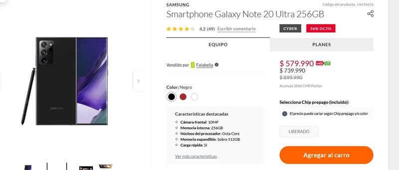 - Samsung Galaxy Note 20: Bajó de $899.990 a $7399.990 e incluso $579.990 si se paga con la tarjeta CMR.