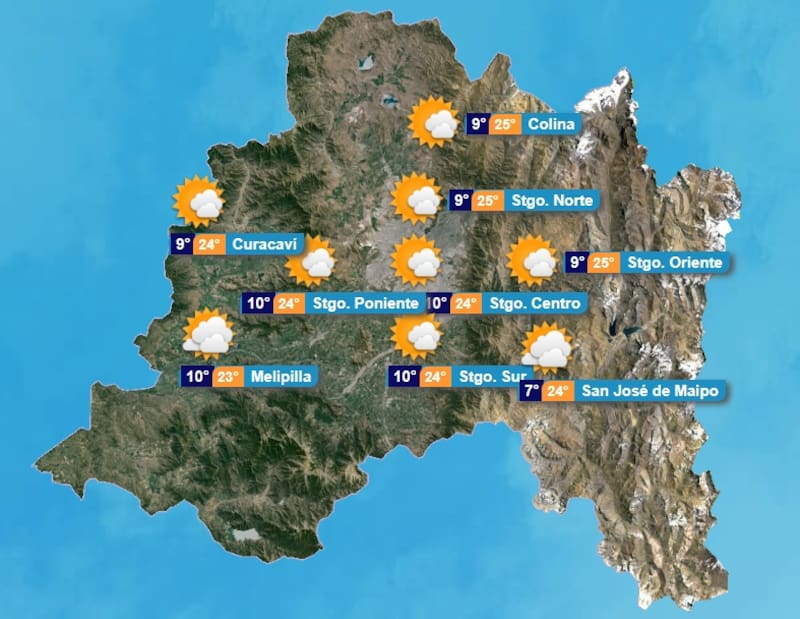 Para esta jornada, la temperatura mínima se mantendrá en la tónica de los últimos días, bordeando los 10 grados en gran parte de la Región Metropolitana, aunque en San José de Maipo será de 7°.