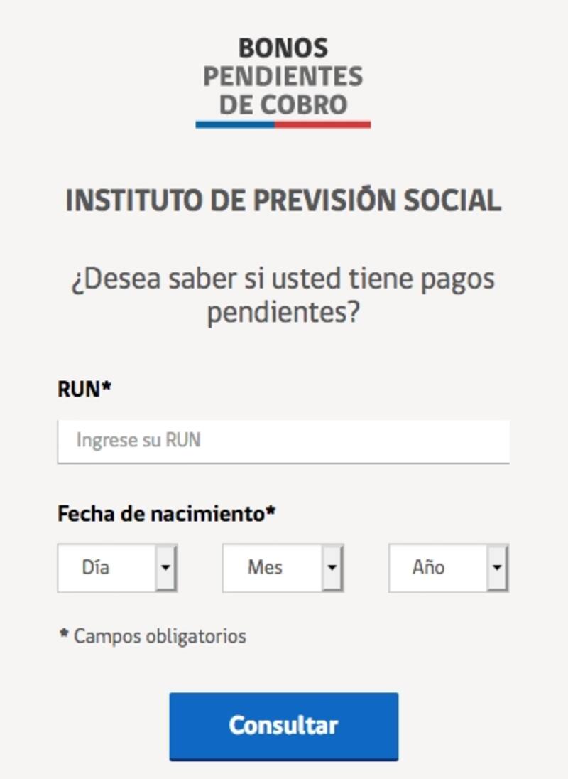 Entre las opciones para conocer si tienes bonos pendientes, aparece la página habilitada por el Instituto de Previsión Social (IPS). El sitio lleva por nombre www.bonospendientes.cl y al ingresar, solo debes completar tu Rut y fecha de nacimiento. Tras ello la página de inmediato te dirá si hay beneficios por recibir.