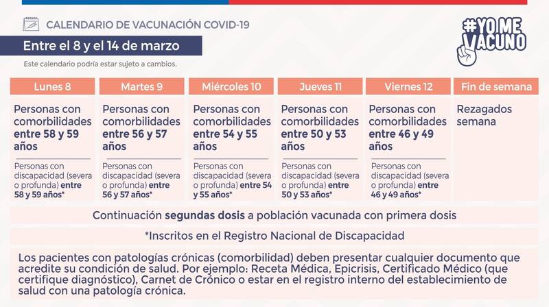 Con todo, el grupo que deberá inocularse este miércoles corresponde al de las personas con comorbilidades entre 54 y 55 años y personas con discapacidad (severa o profunda) de la misma edad.