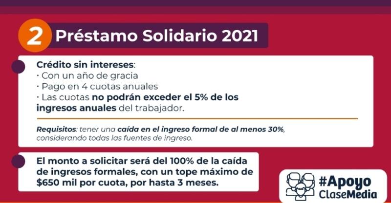 Uno de los tres renovados pilares anunciados por el Gobierno para ir nuevamente en ayuda de la clase media es el Préstamo Solidario, beneficio que permitirá la entrega de un crédito blando a las familias de este segmento más afectadas por la pandemia del coronavirus.