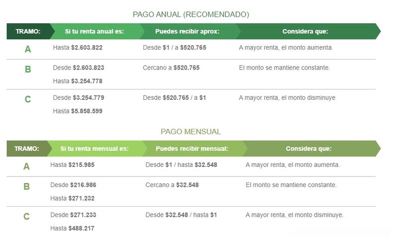 - Para el pago anual: no percibir una renta bruta anual igual o superior a $5.858.599.