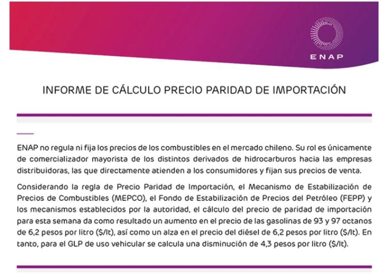 Cabe señalar que ENAP explica en su informe que la proyección de precios "se enmarca en la regla de precio paridad de importación, el Mecanismo de Estabilización de Precios de Combustibles (Mepco), el Fondo de Estabilización de Precios del Petróleo (FEEP), y los mecanismos establecidos por la autoridad".