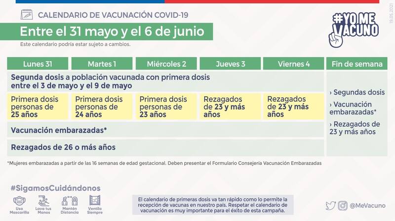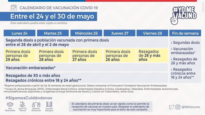 En detalle, la semana entre el 24 y el 30 de mayo podrán acudir a los centros de inoculación las personas de entre 26 y 29 años que requieran de la primera dosis. Así mismo, podrán hacerlo rezagados mayores de 30, crónicos entre 18 y 24 años, y mujeres embarazadas con más de 16 semanas de gestación.