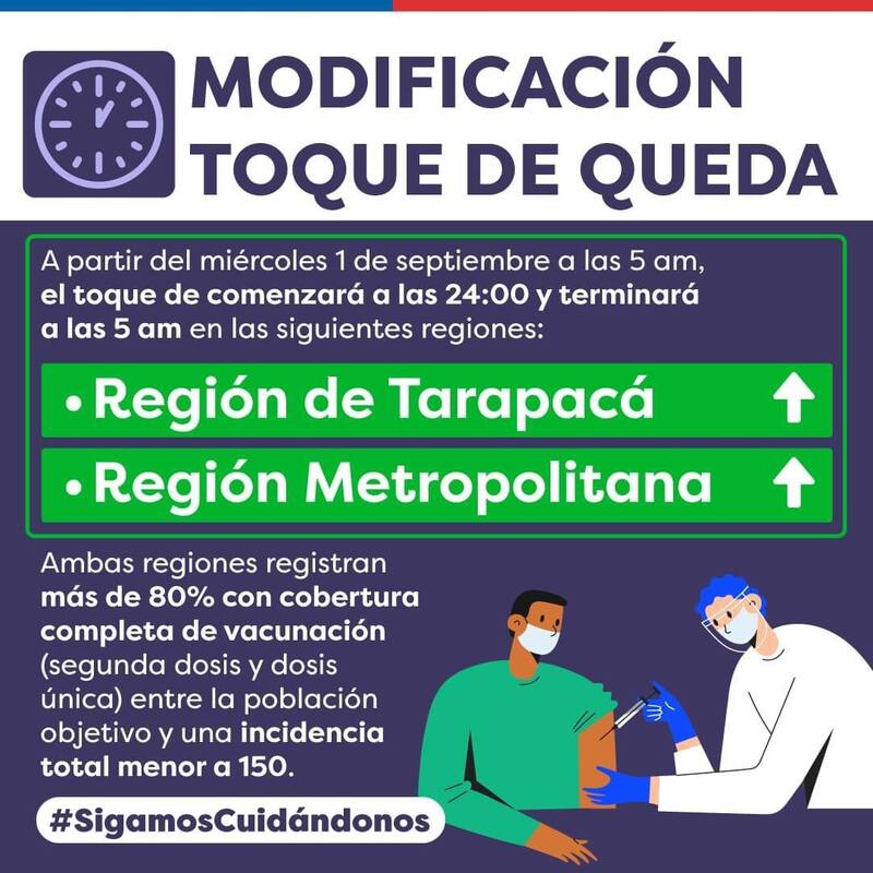 Esta decisión se confirmó a inicios de semana ya que se ha superado el 80% de la población vacunada con segunda o dosis única. "Todo el país va a estar con un toque de queda que comienza a las 12 de la noche, todo el país ha alcanzado el 80% de su población objetivo vacunada", recalcó la subsecretaria Paula Daza.