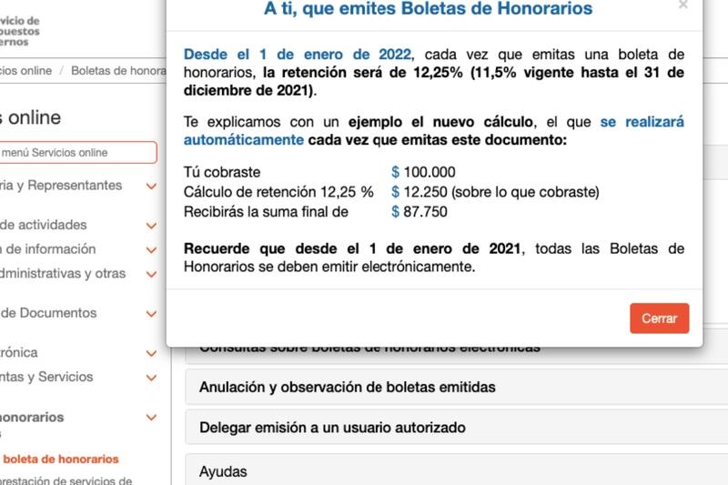 Para este año 2022, el porcentaje de retención de las boletas pasó de 11,5% a 12,25%, medida a la que se suma que todas las boletas de honorarios deberán emitirse electrónicamente.