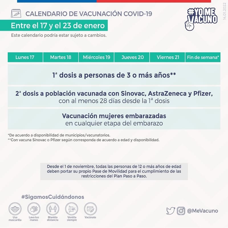 - Hoy domingo 23 enero se podrán vacunar con la primera dosis a personas de 3 o más años. Será con vacuna Sinovac o Pfizer, según corresponda de acuerdo a la edad y disponibilidad.