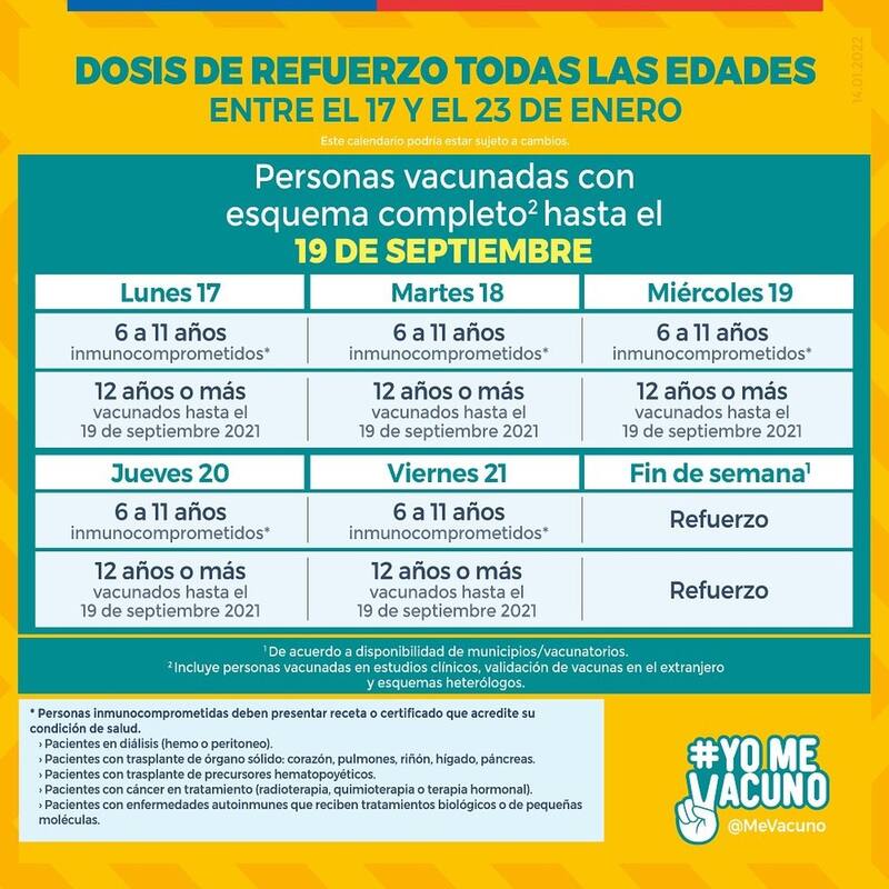 El Ministerio de Salud (Minsal) informa que el calendario de vacunación en Chile continuará su implementación hoy domingo 23 de enero. Para esta jornada se contempla la entrega de la cuarta dosis -o segunda vacuna de refuerzo- para evitar el alza de contagios por Covid-19, lo que en las últimas jornadas ya que supera los 14 mil casos diarios.