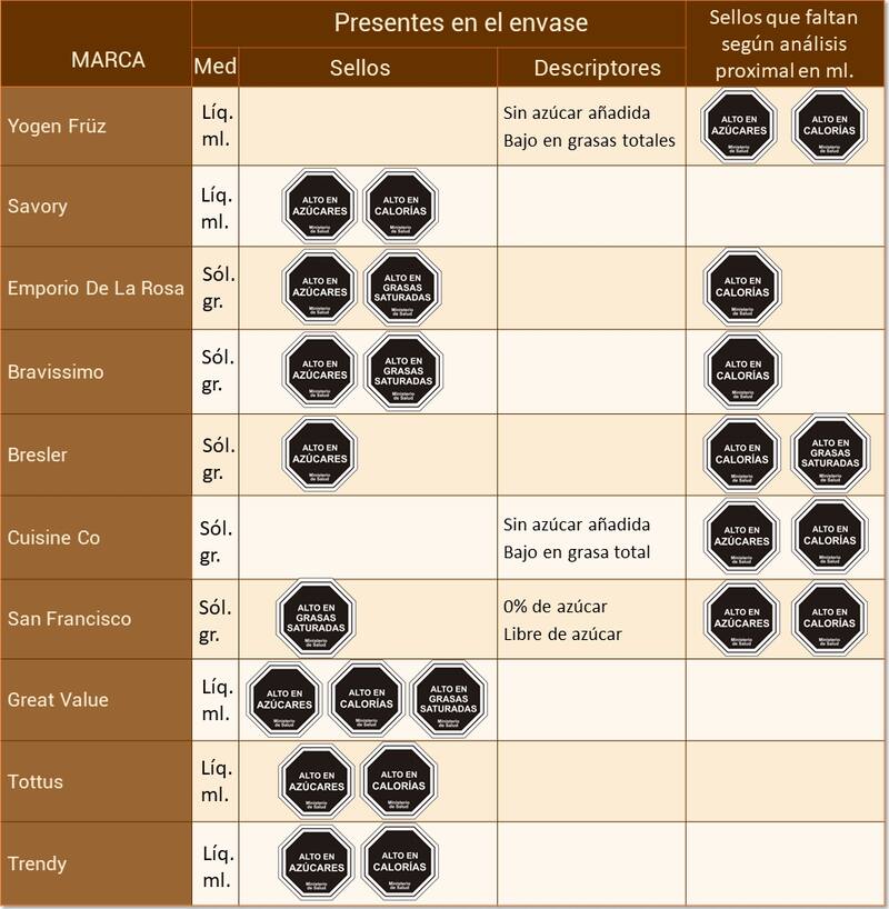Respecto a la Ley de Etiquetado y los sellos "Alto en", donde se es más exigente con alimentos líquidos que en sólidos, la investigación encontró que 5 de las marcas estudiadas etiquetan la información en mililitros y las otras cinco en gramos.