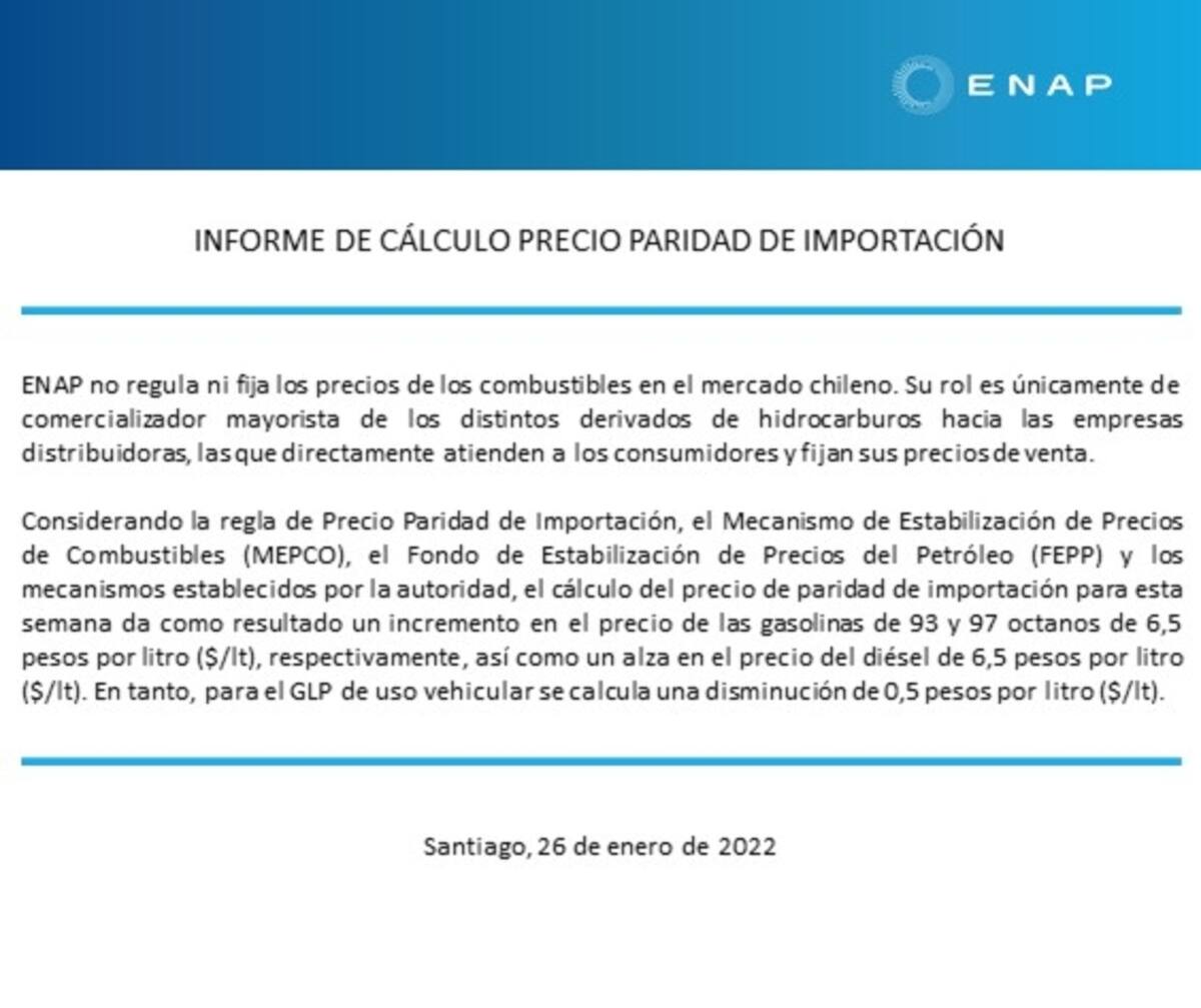 Según reportó Empresa Nacional del Petróleo (ENAP) en su sitio web oficial es que a partir del jueves 27 de enero aumentarán las gasolinas de 93 y 97 octanos, y el Diesel. Por su parte, el Gas Licuado para utilizar en vehículos será el único que presentará una baja.