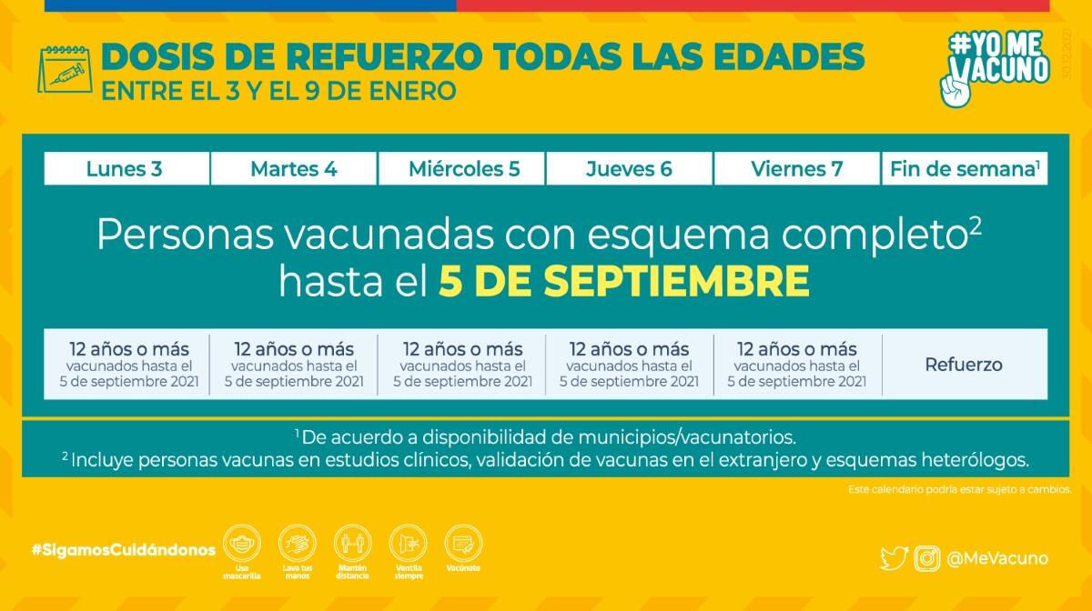 - Tercera dosis de refuerzo a personas de 12 años o más vacunadas con esquema completo hasta el 5 de septiembre de 2021.