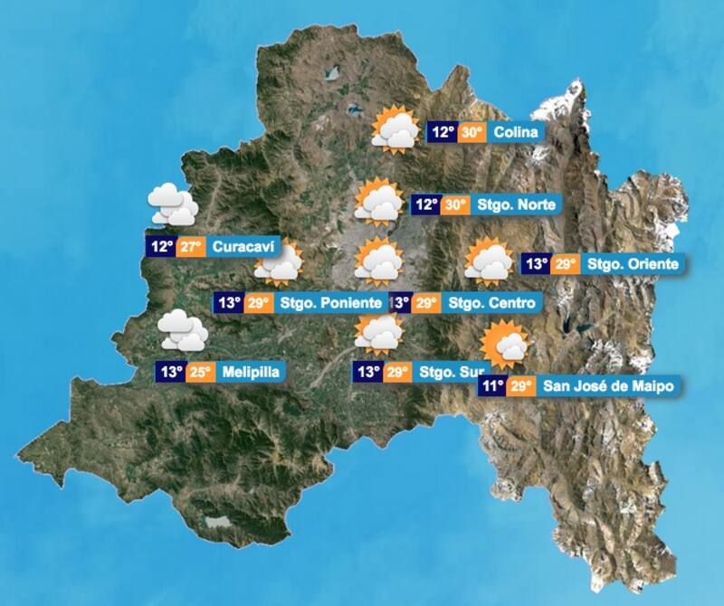 Según indica la Dirección Meteorológica de Chile, las temperaturas llegarán una máxima de 30 grados en Colina y Santiago Norte. En sectores como Santiago Poniente, Centro y Oriente, el peak será de 29 grados. En tanto Melilla será 25ª y Curacaví 27ª.