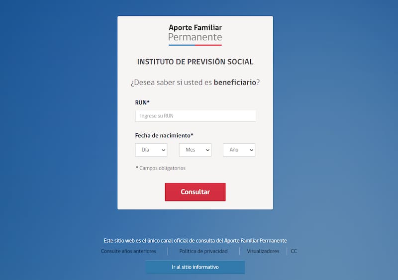 Para conocer si eres una de las personas que no retirado los $52.710, dirígete a la página oficial del Aporte Familiar Permanente y escribe tu RUT, fecha de nacimiento y haz clic en "consultar".