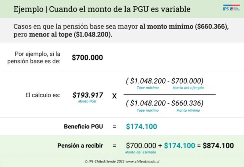 Este monto variará de acuerdo a la pensión que reciba el solicitante. Para quienes tengan una pensión base menor o igual a $660.366 mensuales, el monto de la PGU llegará a $193.917; mientras que quienes perciban una pensión base mayor a $660.366, pero menor a $1.048.200, el monto de la PGU será variable: