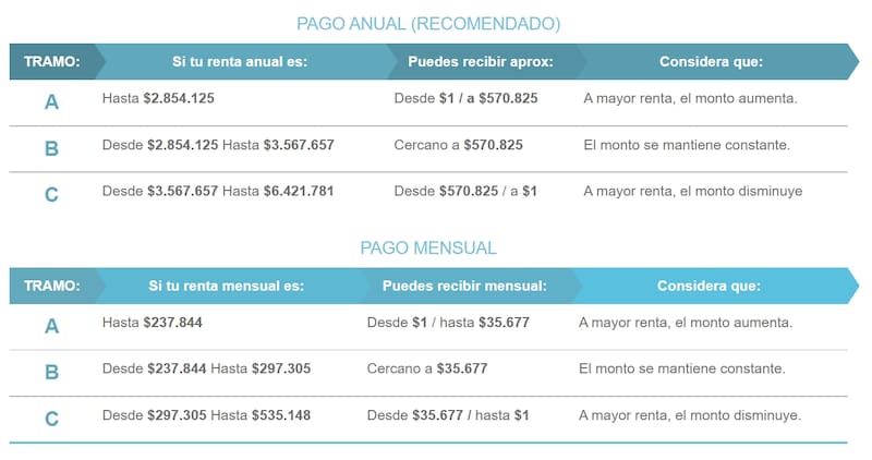 Según informa el sitio oficial del BTM, el monto que podrán recibir las beneficiarias dependerá del sueldo bruto que estas reciban en su empleo. Con este, se te posicionará en alguno de los tres tramos que hay para este subsidio, dependiendo de la modalidad de pago que escojas: