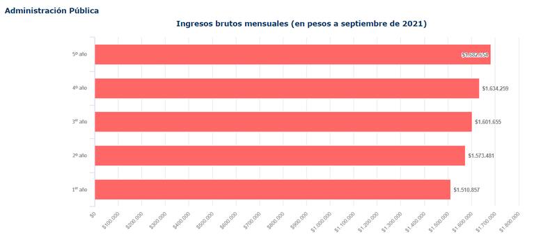 Bajo ese contexto, hay carreras técnicas que reciben una importante cifra a los cinco años de egresados, siendo la mejor pagada Administración Pública, que tiene un sueldo promedio de $1.682.654 y una empleabilidad, hasta 2021, de un 99,3%.