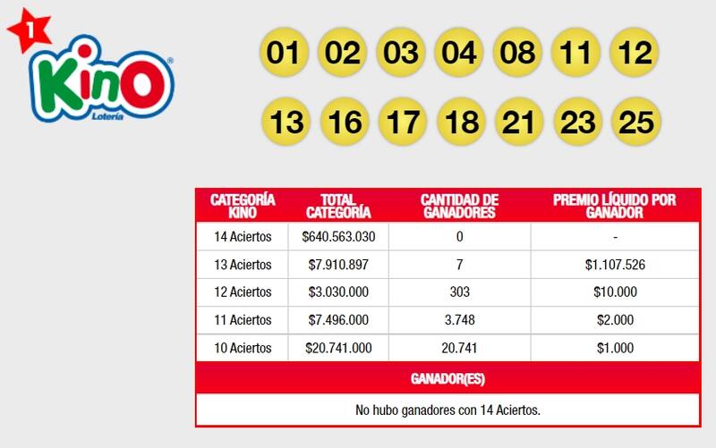 Como se señaló, no se registraron ganadores en la categoría de 14 aciertos del Kino. Lo mismo ocurrió en Combo Marraqueta, Chao Jefe 2 millones y Chao Jefe 1 Millón.