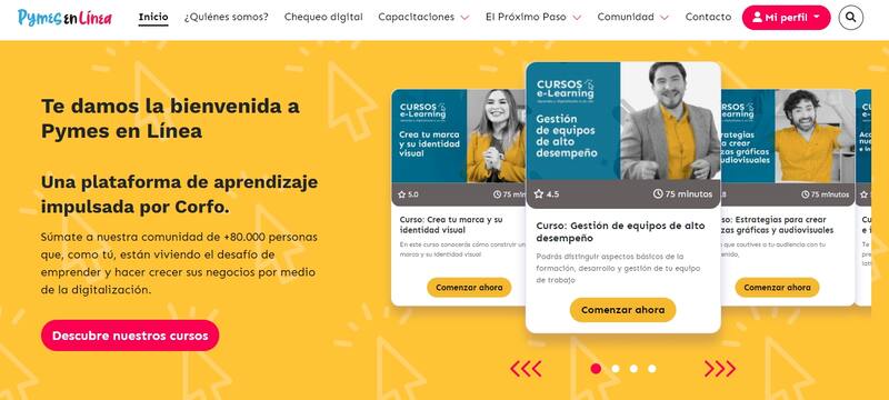 Pymes en Línea es una plataforma web impulsada por Corfo, en el marco del plan Digitaliza tu Pyme del Ministerio de Economía, Fomento y Turismo, que tiene por objetivo ayudar a las Mypimes y emprendimientos chilenos a que aumenten sus conocimientos digitales.