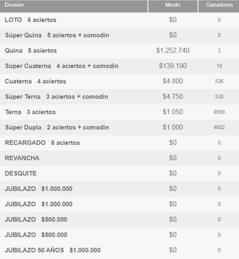 Fue recién en la categoría de Quina en la que dos personas lograron ganar $1.252.740 cada una. Junto con esto, 18 jugadores ganaron $139.190 en Súper Cuaterna.