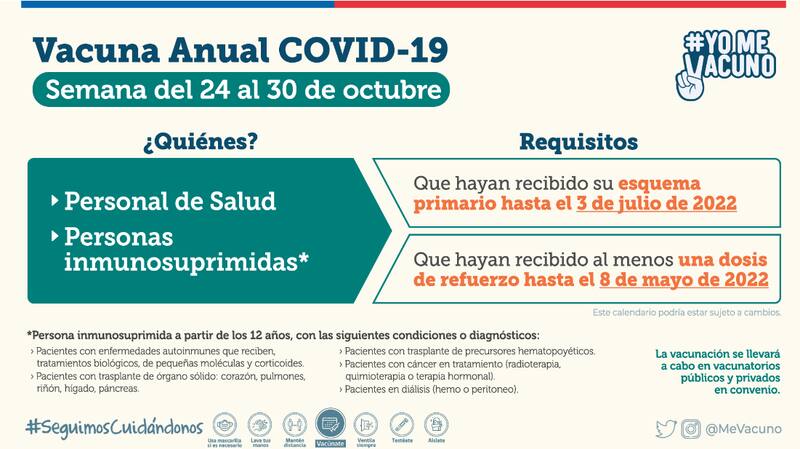 Esta semana pueden recibir la vacuna anual quienes hayan completado su esquema primario hasta el 3 de julio de 2022, o que se hayan aplicado al menos una dosis de refuerzo hasta el 8 de mayo de 2022. Puedes conocer dónde inocularte en la página web Me Vacuno del Gobierno.