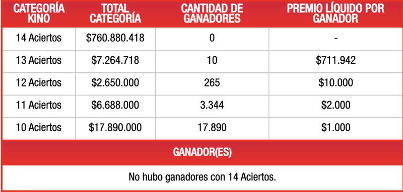 Sin embargo, en Kino 13 aciertos, 10 personas resultados afortunadas y recibirán un premio de $711.942 cada uno. Además, hubo 265 ganadores en la subcategoría de 12 aciertos, quienes ganaron $10.000. En las de 11 y 10 aciertos, más de 20.000 mil personas se quedaron con $2.000 y $1.000, respectivamente.