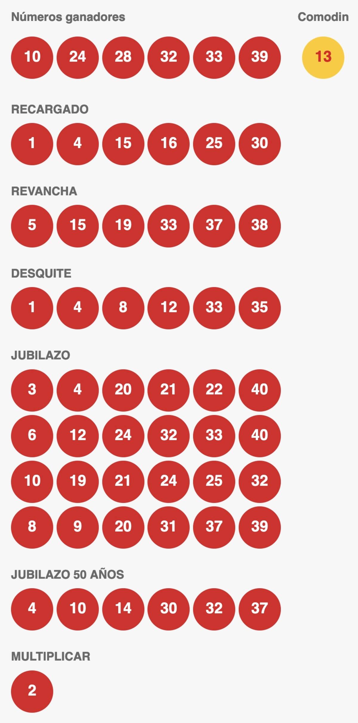Números ganadores: 10, 24, 28, 32, 33, 39.